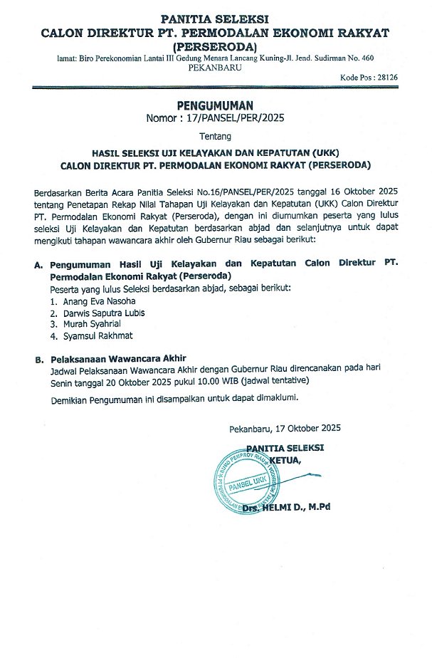 PENGUMUMAN HASIL SELEKSI UJI KELAYAKAN DAN KEPATUTAN (UKK) CALON DIREKTUR PT. PERMODALAN EKONOMI RAKYAT (Perseroda) TAHUN 2025