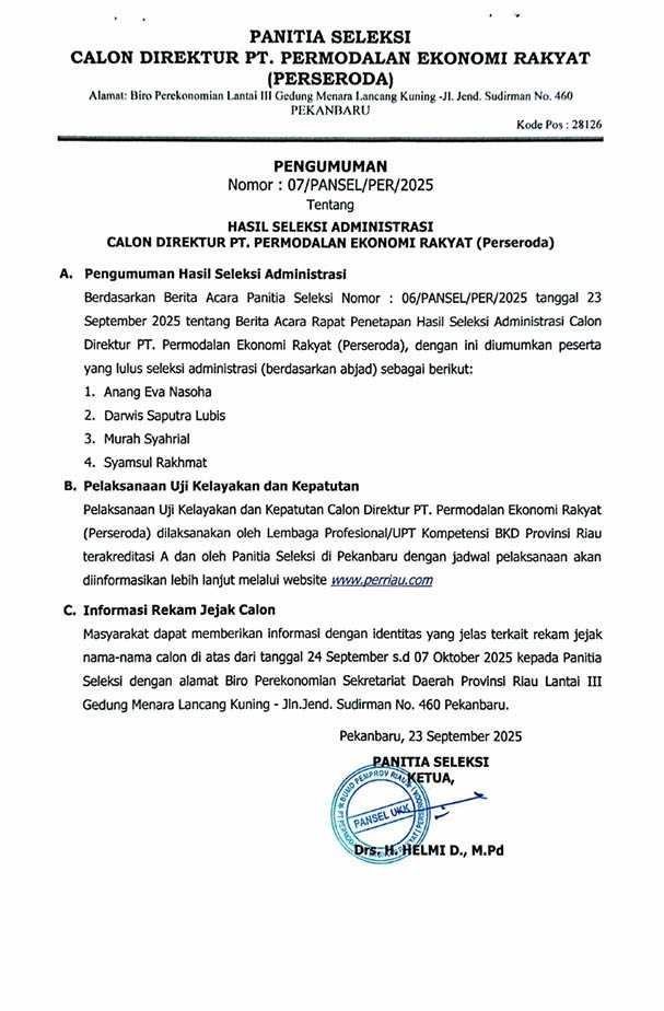 PENGUMUMAN HASIL SELEKSI ADMINISTRASI CALON DIREKTUR PT. PERMODALAN EKONOMI RAKYAT (Perseroda) TAHUN 2025