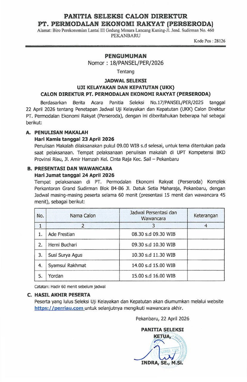 Berdasarkan Berita Acara Panitia Seleksi No.17/PANSEL/PER/2025 tanggal 22 April 2026 tentang Penetapan Jadwal Uji Kelayakan dan Kepatutan (UKK) Calon Direktur PT. Permodalan Ekonomi Rakyat (Perseroda), dengan ini diberitahukan beberapa hal sebagai berikut :